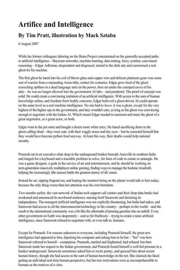 "Artifice and Intelligence" may be the tale of the planet's first self aware computer program, an artificial intelligence that calls himself Saraswati. Whenever a potent business named The Range intends the peace and safety of the planet, Saraswati assembles a group to combat it, but what if the AI's reasons are not what they appear?This short-story was initially published in Strange Horizons in 2007, and later reprinted in The Entire Year's Best SF 13.